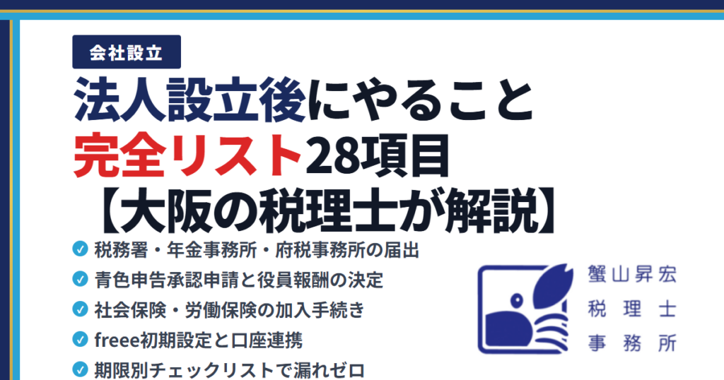 法人設立後にやることは、大きく「5日以内・1か月以内・2か月以内・3か月以内」の4つの期限に分類されます。当事務所の経験上、届出忘れで最も損をするのは「青色申告承認申請書」の期限切れで、これだけで赤字の繰越控除(最大10年)が消えます。本記事では大阪の税理士目線で、優先度順にやること全28項目をリスト化します。