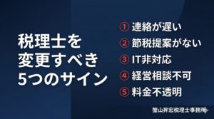 もし今すでに税理士と顧問契約をしていて「なんか違うな」と感じている方は「税理士を変更すべき5つのサイン」も参考にしてみてください。