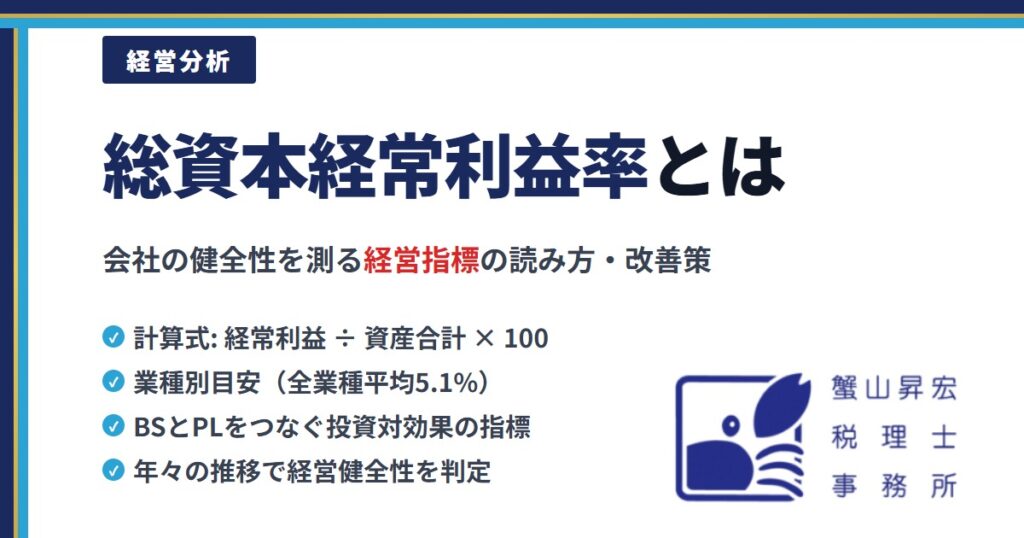 • 総資本経常利益率とは:経常利益 ÷ 資産合計 。「いくら投資していくら儲かったか」を示す収益性指標